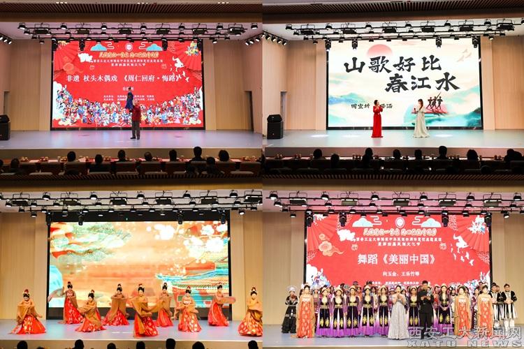 主题展演上篇“爱国礼赞新时代”中,马克思主义学院教师仇倩倩结合生动的事例讲授了一堂精彩的《用青春“朋友圈”铸牢中华民族共同体意识》主题微课,设计学院副教授张婧以《择一事终一生,守护民族文化瑰宝》为题,讲述了参与保护青藏高原建成遗产的亲身经历。在展演下篇“团结奋进向未来”中,两位辅导员崔弘、许金鑫和各民族学生代表动情讲述了西工校园里《石榴花开的故事》,展示了教师精心育人、各族学生努力成长成才的故事。在文艺表演中,民歌对唱《山歌好比春江水》清脆悦耳,马头琴演奏《天边》、《万马奔腾》婉转悠扬,传统舞蹈《盛世》端庄大气,民族舞蹈《千里万里舞天山》婀娜多姿,非遗传承杖头木偶戏《周仁回府》技艺精湛,展演最后各民族学生共跳团结舞蹈《爱我中华》,将现场气氛推向高潮。